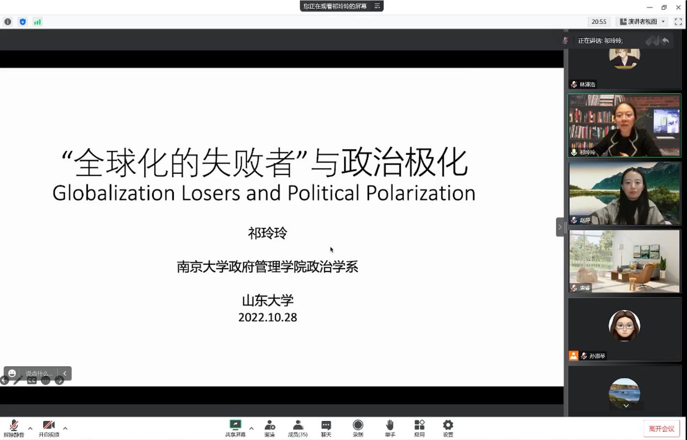 10月28日晚,304永利集团官网入口第十八期PPE讲座以线上形式举行。南京大学政府管理学院副教授祁玲玲作了题为“全球化的失败者与政治极化”的学术报告,304永利集团官网入口齐鲁青年学者唐睿教授作为嘉宾进行了交流点评。讲座由304永利集团官网入口政治学与公共管理学院副院长赵婷主持。