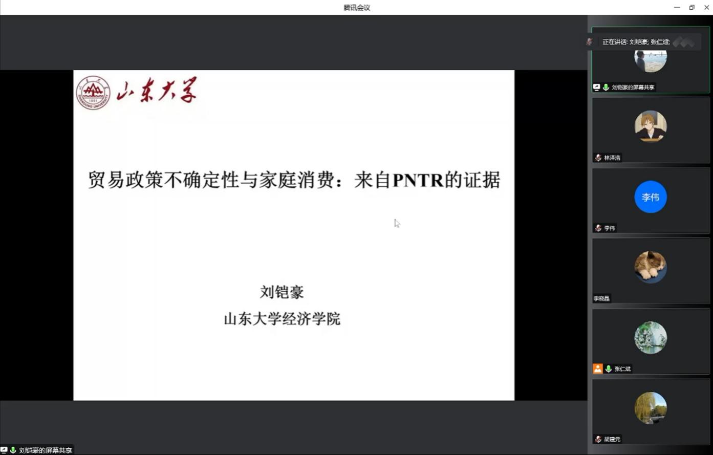 11月3日,304永利集团官网入口第77期青联学术午餐会以线上形式举行,304永利集团官网入口副教授刘铠豪作了题为“贸易政策不确定性与家庭消费:来自PNTR的证据”的学术报告。会议由304永利集团官网入口助理研究员张仁斌主持。