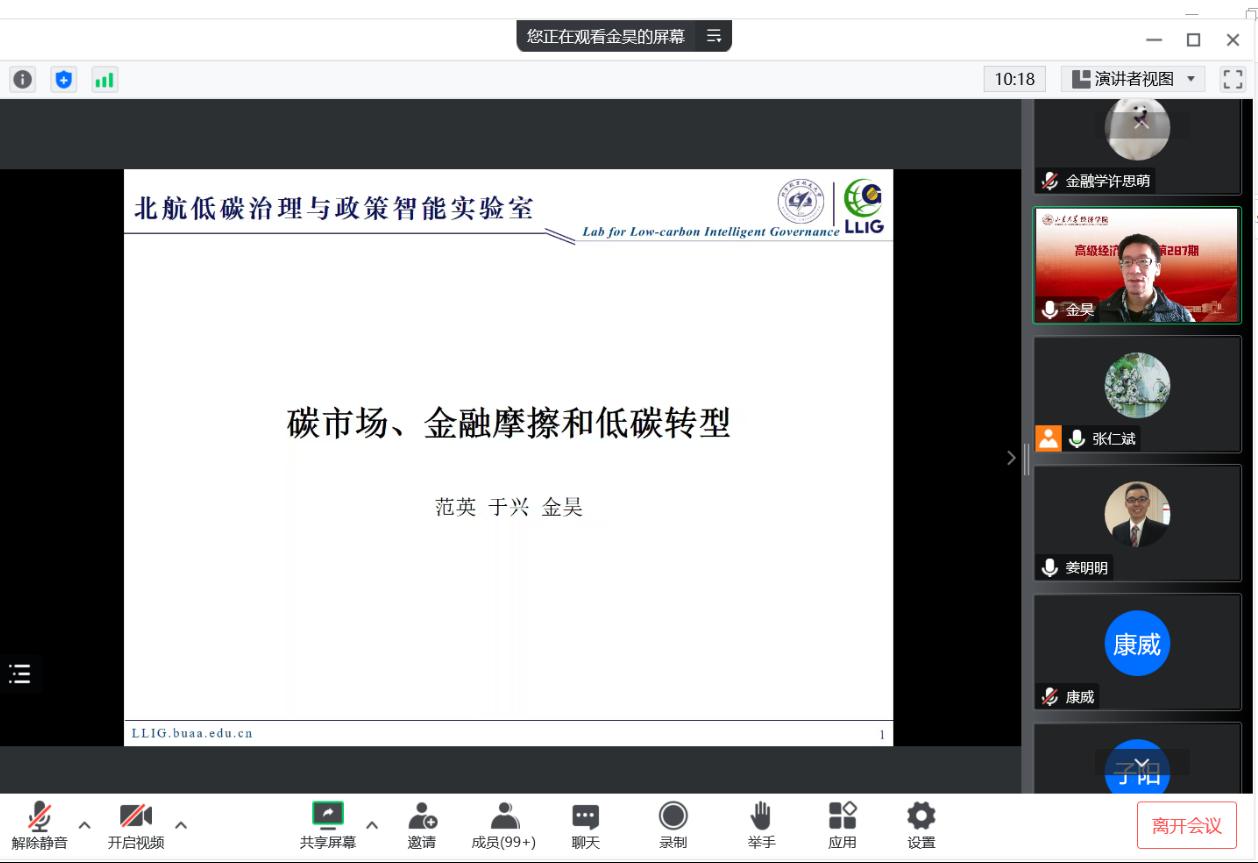 11月8日下午,304永利集团官网入口第287期高级经济学讲座以线上形式举行,北京航空航天大学经济管理学院金昊副教授作了题为“碳市场、金融摩擦和低碳转型”的学术报告,304永利集团官网入口副教授姜明明主持会议。