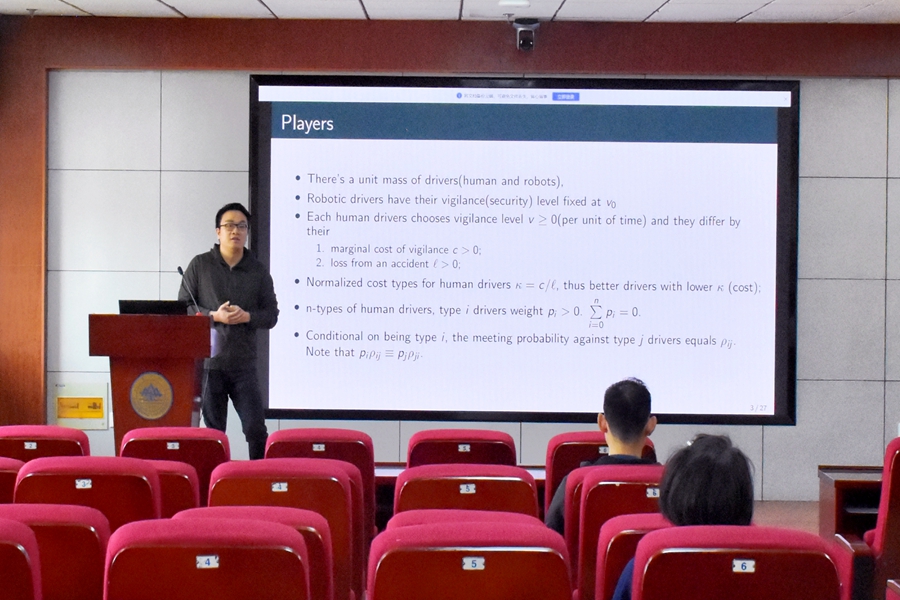 杨逸希研究了司机之间的博弈行为对驾驶者的驾驶行为影响,围绕研究的基准模型、均衡分析、比较静态分析和佩兹曼效应、实证结果四个方面展开汇报。报告伊始,杨逸希对文章所涉及的博弈参与人和各种假设等作了详细说明。在均衡分析方面,他通过构建函数求解最小值,得出了“在博弈中存在唯一纳什均衡”的结论。在比较静态分析方面,杨逸希考察了导致交通事故的因素增强、自动驾驶更加安全时,司机在均衡状态下的警觉性会如何变化。结果表明,当交通密度增大时,司机会提高警惕性;当自动驾驶更安全时,司机的警惕性可能会因自身类型而有所区别。报告中,杨逸希分析了经典的佩兹曼效应,即当道路状况变差时,司机驾驶汽车会更加谨慎,此时的风险补偿效应可能会超过直接效应。同时,他指出如果放松效应较强,那么风险补偿效应可能不会存在。此外,在稳健性检验中,他将检验时间段选择为晚八点至早六点,结果与基准检验一致。报告过程中,杨逸希与参会老师就实证模型、样本选择等相关问题展开了充分讨论。