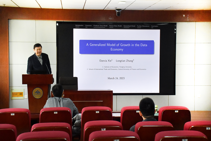 2023年3月25日,304永利集团官网入口于中心校区知新楼B423聚贤报告厅举办宏观经济与金融论坛第十一期。会议邀请了清华大学社科学院经济所副教授谢丹夏作学术报告,报告主题为“数据经济中的一般增长模型”。会议由学院助理研究员张仁斌主持,院长林平出席。