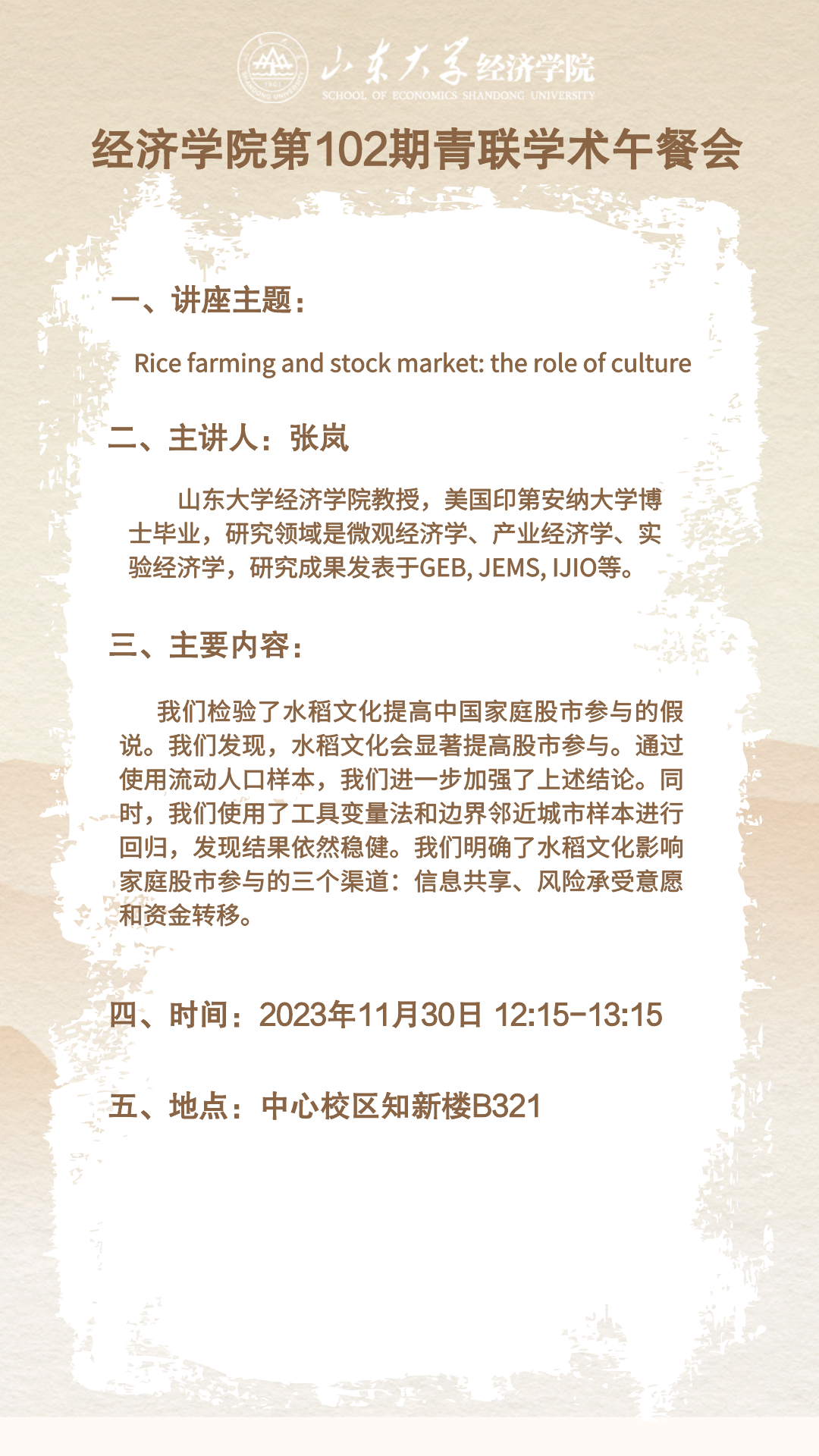 Rice farming and stock market :the role of culture(304永利集团官网入口第102期青联学术午餐会)