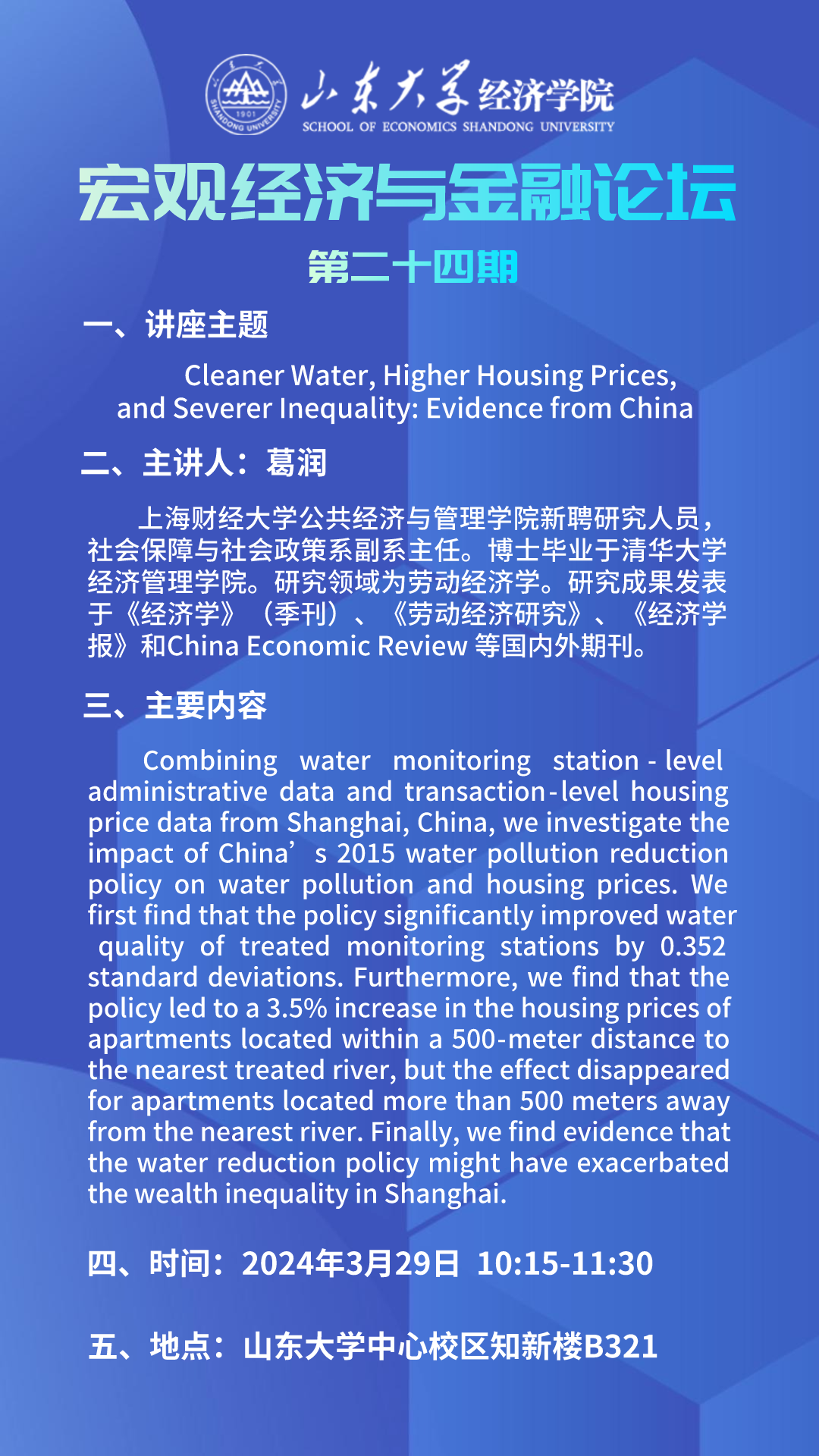 Cleaner Water,Higher Housing Prices,and Severer Inequality:Evidence from China (宏观经济与金融论坛第二十四期)